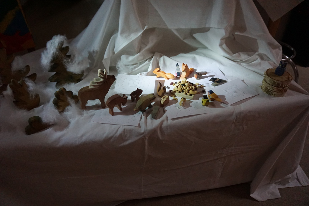 Endlich hat das Warten ein Ende. Alle treffen sich in der Halle zur Weihnachtsfeier. Schon Tage vorher wurde die Krippe aufgebaut und täglich erweitert. Am Freitag gab es dann die Geschichte von der