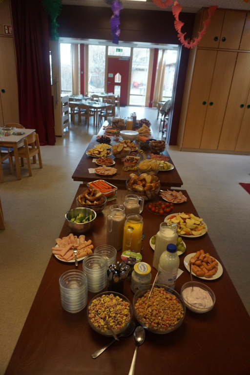 Am Faschingsfreitag durften die Kinder wieder verkleidet in den Kiga kommen. In den Gruppen wurde gespielt, gesungen….. bei einigen war es auch gemütlich. Zum gemeinsamen Frühstücksbuffet war die „reichhaltige Tafel“ in der Halle und im Turnraum gedeckt.
